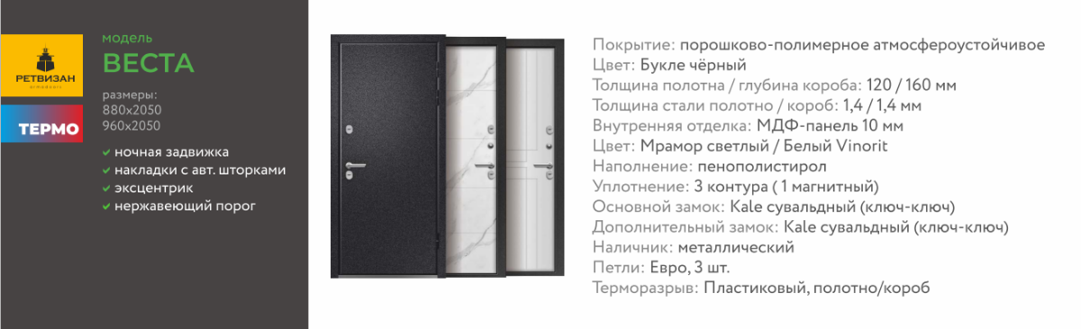 Внутреннее покрытиеФрезерованная МДФ-панельВнешнее покрытиеПорошково-полимерное «Антик/Букле/Шагрень»НаполнительПенополистиролконтур уплотнения3 (контур)Толщина полотна120 (мм)Глубина монтажной рамы160 (мм)Магнитный уплотнительестьСортировка (склад)«Сибирь»ПроизводительРетвизан (Новосибирская область, г. Обь)Толщина стали1.4 мм