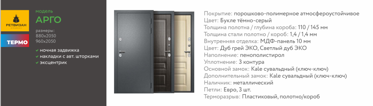 Внутреннее покрытиеФрезерованная МДФ-панельВнешнее покрытиеПорошково-полимерное «Антик/Букле/Шагрень»НаполнительПенополистиролконтур уплотнения3 (контур)Толщина полотна110 (мм)Глубина монтажной рамы145 (мм)Сортировка (склад)«Сибирь»ПроизводительРетвизан (Новосибирская область, г. Обь)Толщина стали1.4 мм